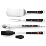 4pc BBQ Set Wusthof signature triple-rivet handle designHeat-resistant POM handle constructionEasy care nonreactive stainless steel constructionDesigned with long enough handles to protect hands from flare-ups but still maintain controlBrushed stain-free steel is strong and durable without being too heavyEach tool features a ring at the end for grill hook storage6.5â Commercial-sized perforated paddleMeat fork with curved tines ... View Details » |