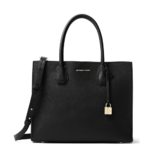 Michael Kors Mercer Large Bonded-Leather Satchel Crafted from pebbled leather, our streamlined Mercer tote is a thoughtful update to a timeless silhouette. Tuck important items - such as your keys, phone and walletâin the median zippered compartment, and carry it by its elegant top handles or go hands-free with the removable shoulder strap.SpecificationsColor: Black ... View Details » |