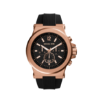 Michael Kors Chronograph Dylan Black Silicone Watch Bright rose-gold-tone metal makes an impact against this black-on-black Dylan watch by Michael Kors. Product Features: Black ribbed silicone strap, Round rose-gold-tone stainless steel case, 48mm, Black chronograph dial with applied numerals at twelve o'clock, Stick indices, minute track, date window, three subdials, three hands, Quartz movement, Water resistant to 100 meters ... View Details » |