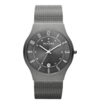 Skagen Denmark Titanium Watch A strong design and a comfortable fit. This Skagen Denmark watch features a titanium-plated stainless steel mesh bracelet and lightweight round case. Charcoal dial with tonal luminous numerals, date window and logo. Quartz movement. Water resistant to 30 meters. ... View Details » |