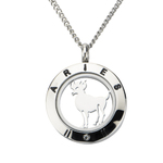 Crafted in bright polish stainless steel, this pendant features a silhouette of a Zodiac Sign. A lone, clear crystal and black engraved details accent the polished frame, giving it a simple yet striking appeal.